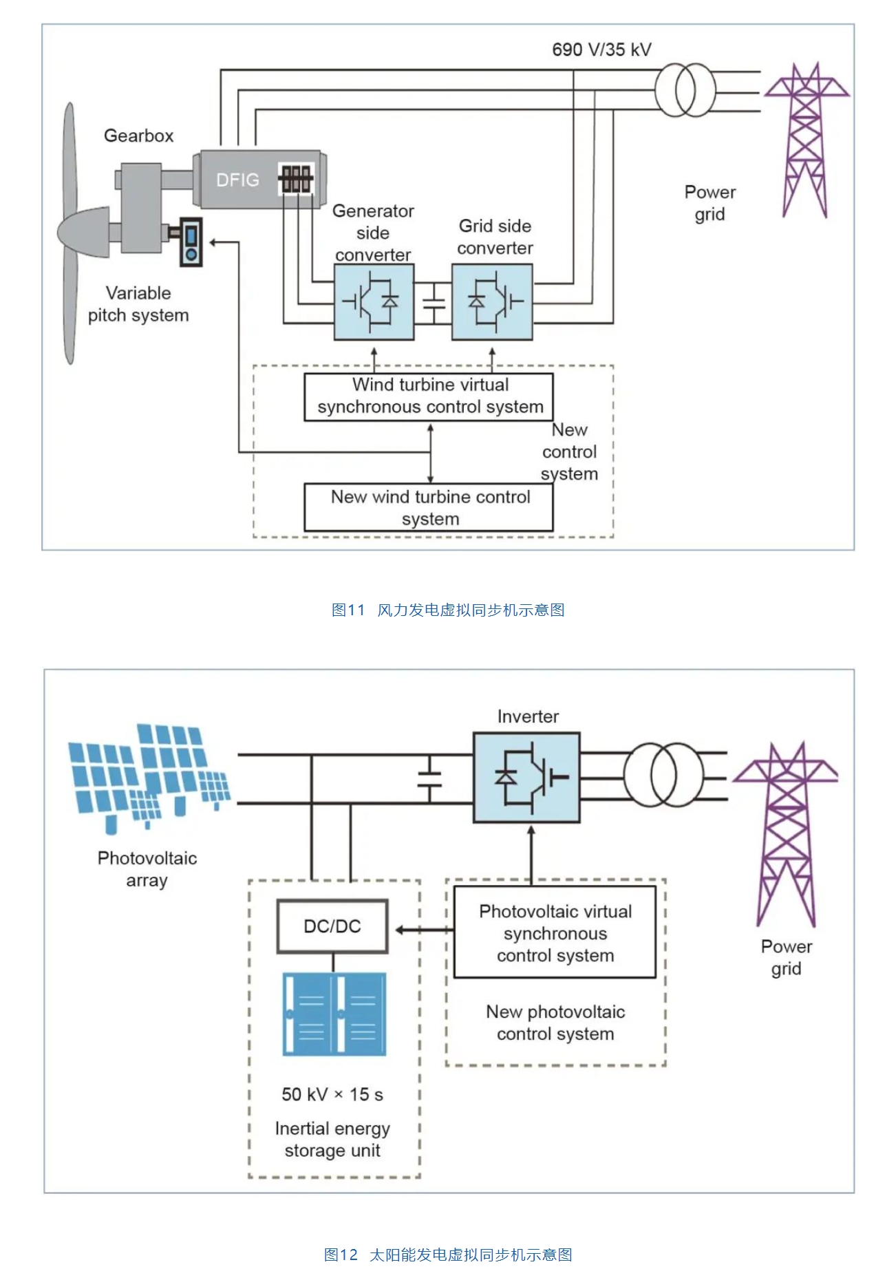 可再生能源利用率的不斷提高給未來電力系統(tǒng)安全穩(wěn)定的運行帶來了不可忽視的挑戰(zhàn)。大規(guī)模的可再生能源應該成為主要的能源來源。對可再生能源發(fā)電的調(diào)峰、調(diào)頻、慣性支撐等關鍵技術進行研究是十分必要的。圖11、圖12給出了用于風力發(fā)電和太陽能發(fā)電的虛擬同步機技術,對提高可再生能源發(fā)電的并網(wǎng)友好性能和電網(wǎng)的主動支撐能力具有重要意義。