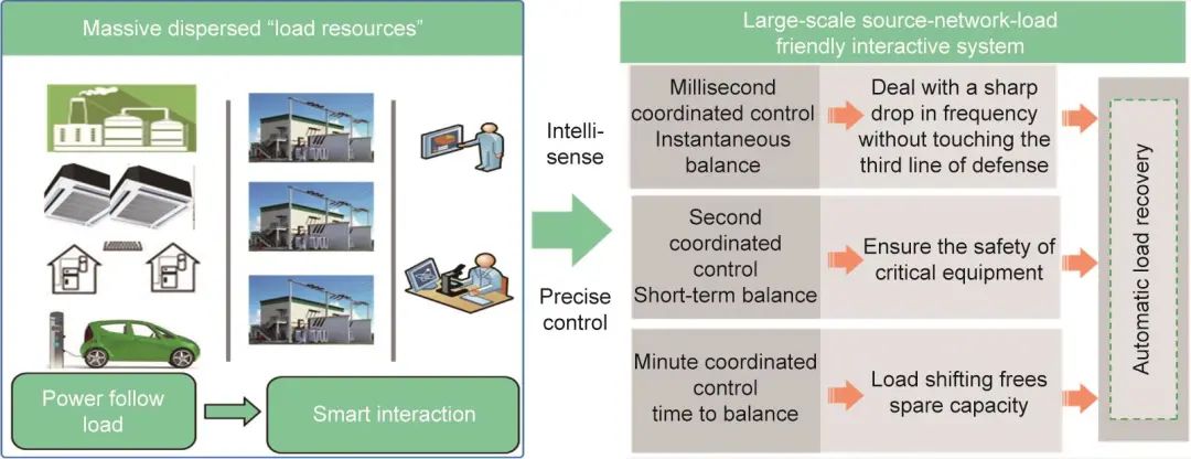 以江蘇電網(wǎng)采用的源-網(wǎng)絡-負荷友好交互技術為例,如圖10所示,江蘇將大量分散的微負荷納入可控資源,并網(wǎng)發(fā)電,并實現(xiàn)了源-網(wǎng)絡-負荷之間的大規(guī)模友好交互。傳統(tǒng)的“源隨網(wǎng)動”模式轉(zhuǎn)變?yōu)椤霸措S荷動、荷隨網(wǎng)動”的智能交互模式。通過大規(guī)模毫秒/秒/分精確負荷控制,實現(xiàn)發(fā)電、供電、用電的友好互動,從而有效擴展電網(wǎng)故障時的可控資源,完善大電網(wǎng)安全控制措施,以及推進可再生能源全額保障性消費和能源供給側(cè)結構性改革。