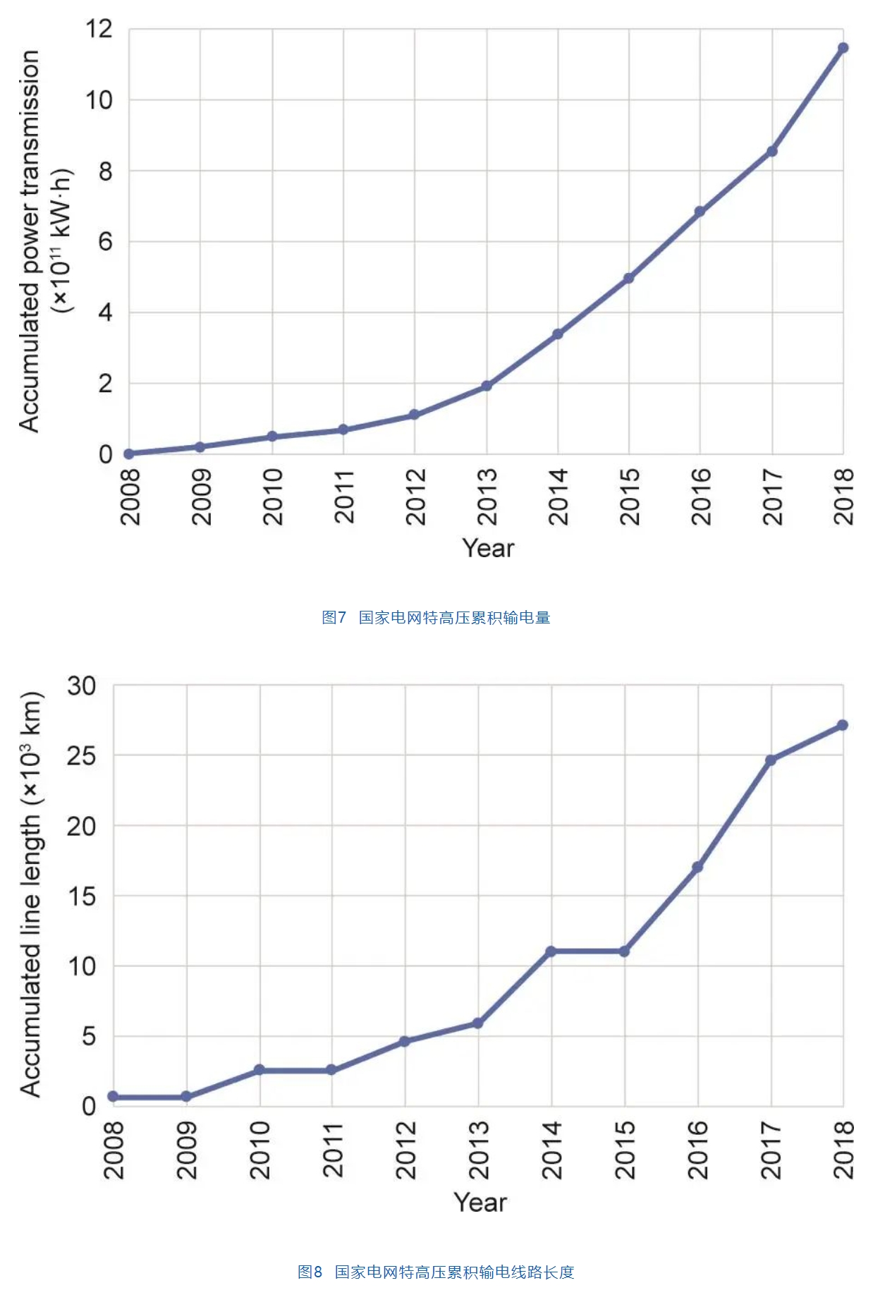 以國家電網(wǎng)特高壓輸電線路建設為例,圖7、圖8分別為2008—2018年累計輸電量和累計輸電線路長度。在此期間,特高壓輸電線路長度從640 km增加到27114 km,增長了42倍。累計輸電量從2008年的7.7 × 107 kW·h增加到2018年的1.145777 × 1012 kW·h,增長了14880倍。特高壓輸電線路的建設有助于解決電源和負荷不平衡問題,提高了可再生能源的消納能力。