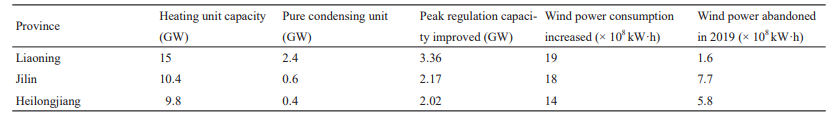 例如,遼寧電網(wǎng)在提高火力發(fā)電靈活性后,大大提高了供熱時可再生能源的采用率。表4為吉林和黑龍江電網(wǎng)具體數(shù)據(jù)對比。遼寧電網(wǎng)供熱運行能力為1.5 × 107 kW,純冷凝運行能力為2.4 × 106 kW。假設供熱容量和純冷凝容量分別提高20%和15%,計算定容調(diào)峰容量可提高3.36 × 106 kW,比吉林電網(wǎng)和黑龍江電網(wǎng)分別提高54.8%和66.3%。此外,還可以增加風力發(fā)電電量1.9 × 109 kW·h,使遼寧成為東北地區(qū)棄風電量最少的省份:2019年為1.6 × 108 kW·h,比吉林和黑龍江分別低79.2%和72.4%。這有助于解決冬季棄風的問題,使遼寧減少煤炭消耗62.7萬噸、二氧化碳排放150萬噸、二氧化硫排放8000 t、氮氧化物排放4.4萬噸。