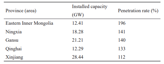 表1列出了2018年中國部分省份的可再生能源裝機容量和滲透率(滲透率= 2018年年底可再生能源裝機容量/2018年最大負荷),表明中國可再生能源負荷容量不足。部分省份(內(nèi)蒙古東部、寧夏、甘肅、青海、新疆)可再生能源普及率超過100%,超過丹麥、西班牙、葡萄牙等發(fā)達國家。