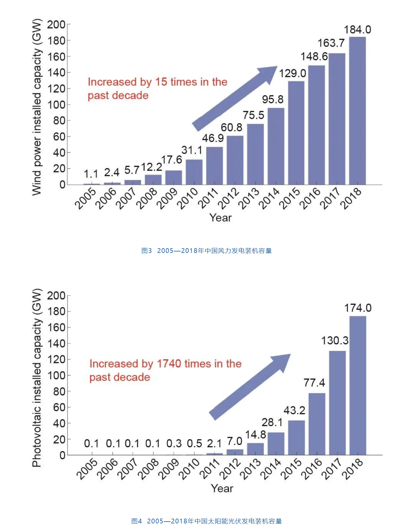《中國可再生能源展望2018》顯示,到2035年,中國的風力發(fā)電和太陽能發(fā)電裝機容量預計將達到1.826 × 109 kW和1.962 × 109 kW,占預估總裝機容量(5.366 × 109 kW)的34.0%和36.6%,比2018年增加了1.642 × 109 kW和1.788 × 109 kW??稍偕茉吹谋戎卣谘杆僭鲩L,將成為中國未來的主要能源來源。