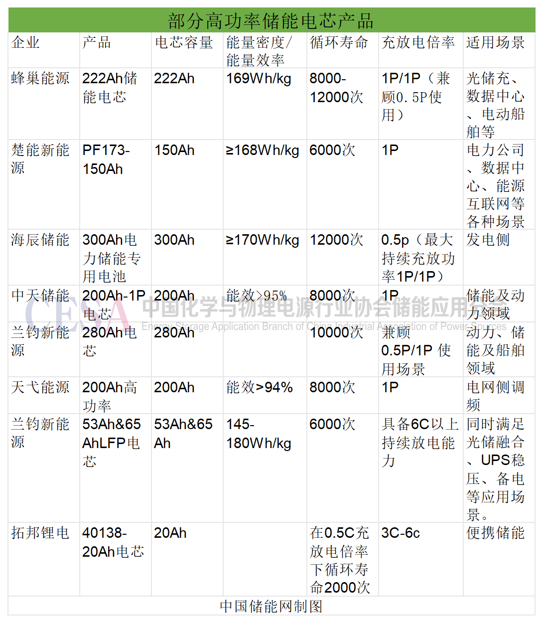 對比上述幾家1p高功率電芯研發(fā)廠商的產品可以發(fā)現,多數產品電芯容量在300Ah以下,海辰儲能300Ah電力儲能專用電池是300+大容量電芯產品里唯一一個可以滿足1P充放電倍率的產品。另外,在1P充放電倍率下,蜂巢能源、海辰儲能、蘭鈞新能源電芯循環(huán)壽命能達到10000-12000次,