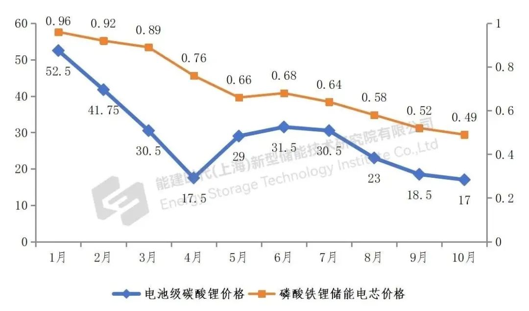 2023年碳酸鋰和電芯價(jià)格走勢(shì)(萬(wàn)元/噸、元/Wh)