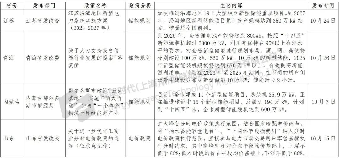 10月,江蘇、內(nèi)蒙、青海、山東4省共發(fā)布儲(chǔ)能相關(guān)重要政策4條。