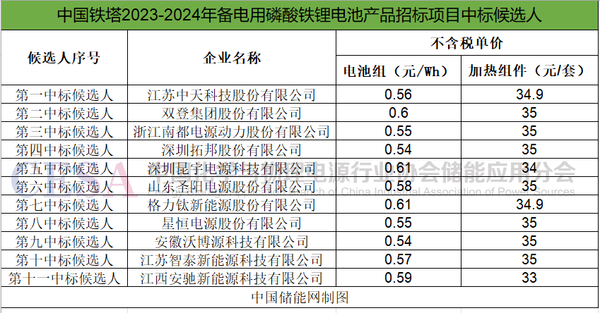 中國儲(chǔ)能網(wǎng)訊:近日,中國鐵塔2023-2024年備電用磷酸鐵鋰電池產(chǎn)品集中招標(biāo)項(xiàng)目公示中標(biāo)候選人。本項(xiàng)目共33名投標(biāo)人參與投標(biāo),最終,11家企業(yè)入圍中標(biāo)候選人。