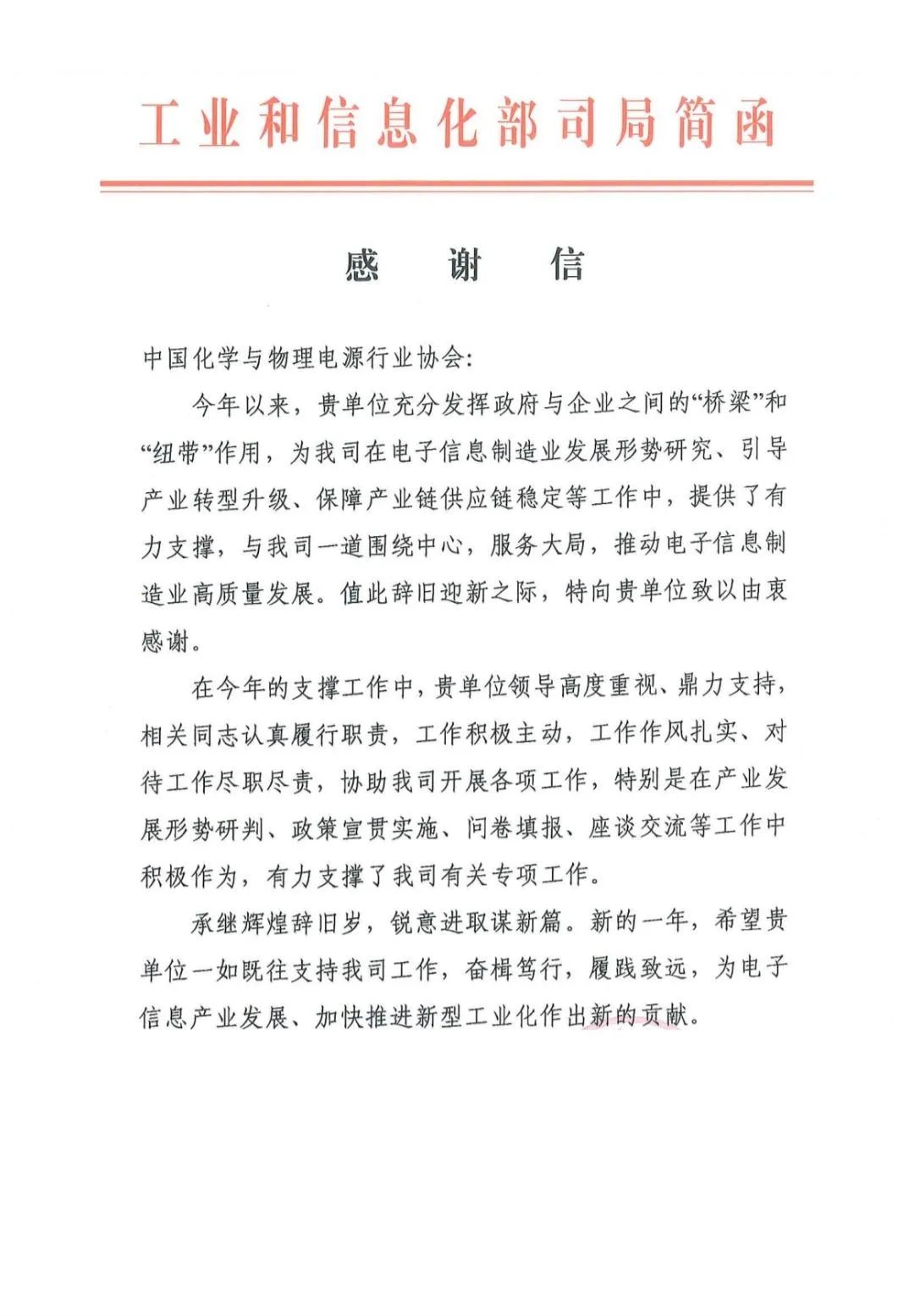 中國儲能網(wǎng)訊:近日,工業(yè)和信息化部電子信息司發(fā)來感謝信,充分肯定我會在政府和企業(yè)之間發(fā)揮的“橋梁”和“紐帶”作用。為該司在電子信息制造業(yè)發(fā)展形勢研究、引導(dǎo)產(chǎn)業(yè)轉(zhuǎn)型升級、保障產(chǎn)業(yè)鏈供應(yīng)鏈穩(wěn)定等工作中提供里有力支撐。