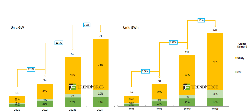該公司預(yù)計在未來一年,全球部署的商業(yè)和工業(yè)(C&I)儲能系統(tǒng)的裝機(jī)容量將出現(xiàn)巨大增長。然而,公用事業(yè)規(guī)模電池儲能系統(tǒng)將在2024年主導(dǎo)全球儲能行業(yè)的增長,今年部署電網(wǎng)規(guī)模儲能系統(tǒng)裝機(jī)容量將達(dá)到53GW/128.6GWh。
