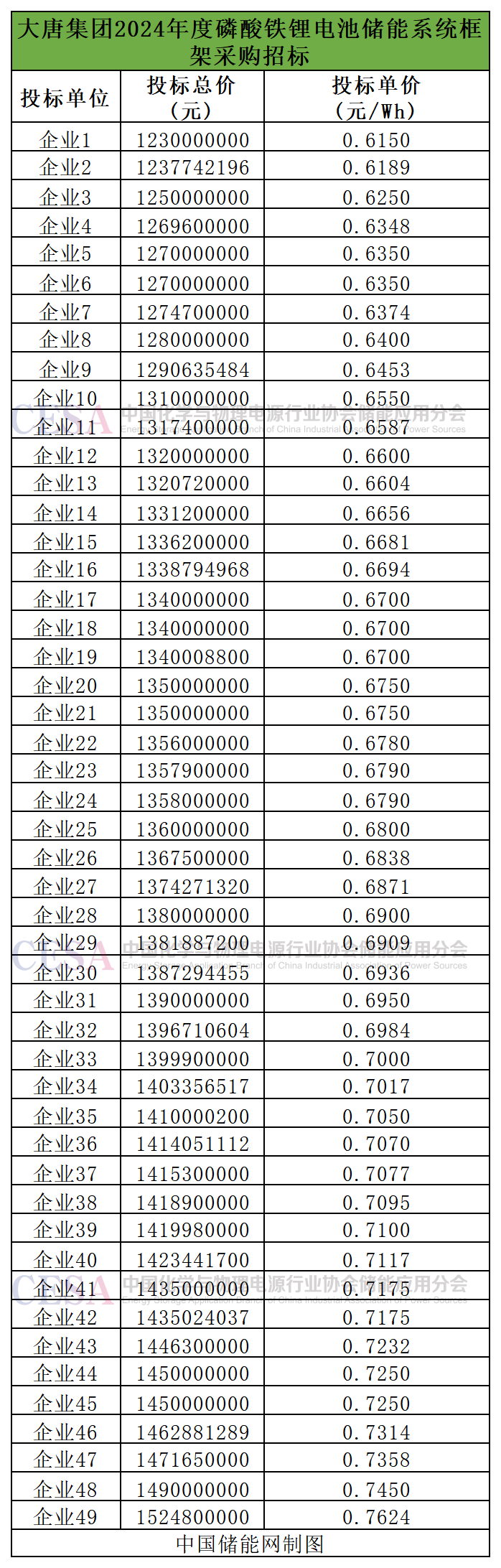 中國(guó)儲(chǔ)能網(wǎng)訊:1月16日,大唐集團(tuán)2024年度磷酸鐵鋰電池儲(chǔ)能系統(tǒng)框架采購(gòu)項(xiàng)目開(kāi)標(biāo),吸引了49家企業(yè)參與投標(biāo),最低報(bào)價(jià)0.615元/Wh,最高報(bào)價(jià)0.762元/Wh,平均報(bào)價(jià)0.683元/Wh。
