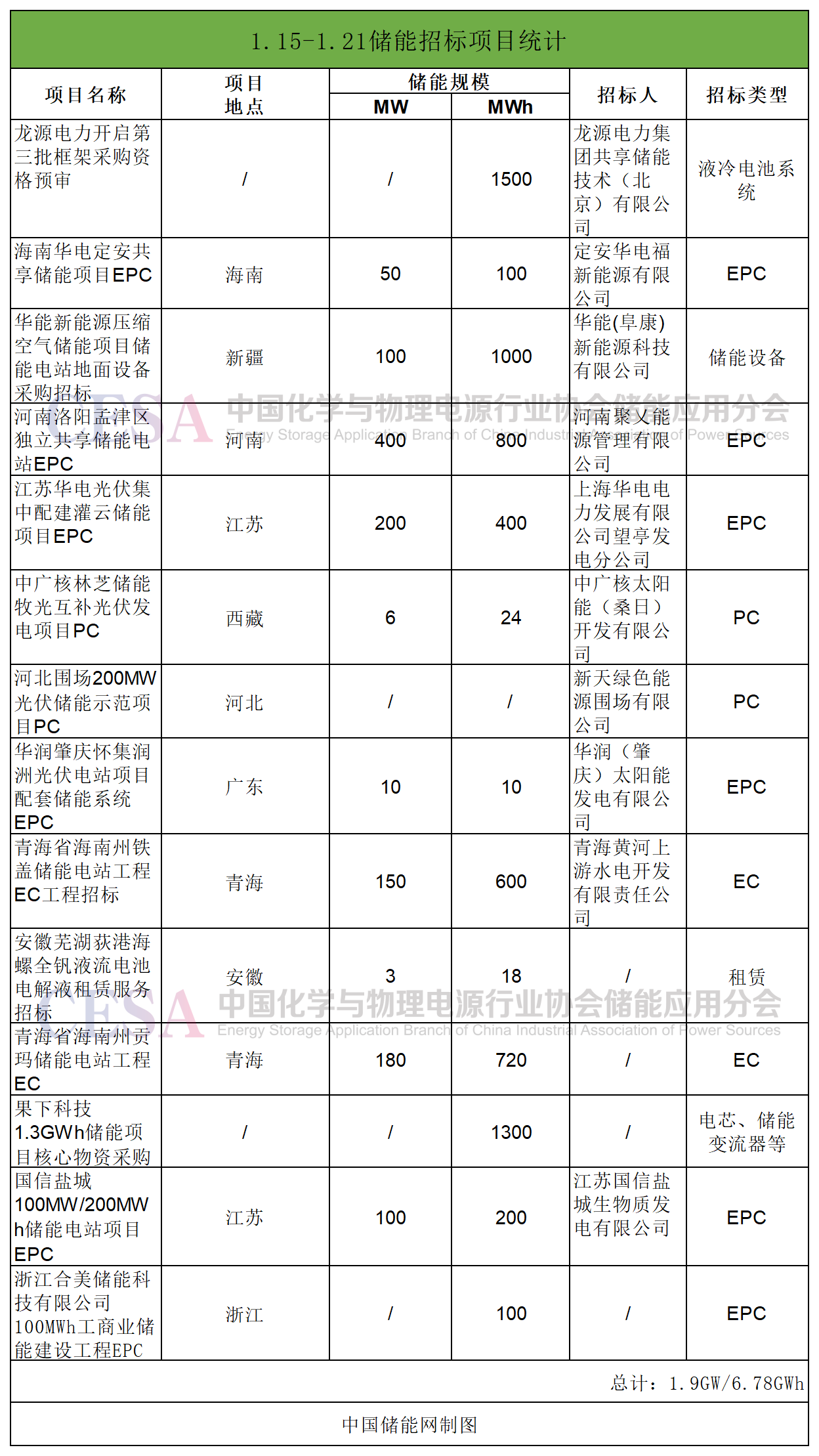 中國儲能網(wǎng)訊:2024年1月第三周儲能招標(biāo)市場依舊火爆,據(jù)中國儲能網(wǎng)不完全統(tǒng)計,本周共計1.9GW/6.78GWh儲能項目開啟招標(biāo),主要以EPC為主,其中包括4個GWh級別的招標(biāo)項目,分別是: