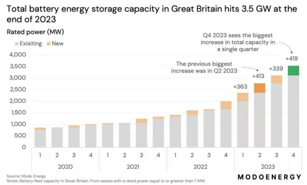 中國儲能網(wǎng)訊:能源研究咨詢機構Modo Energy公司日前證實,英國在2023年第四季度開通運營了420 MW電池儲能系統(tǒng)。其裝機容量與上一季度相比增長了13%,成為英國有史以來運營電池儲能系統(tǒng)最高季度。而之前的季度紀錄是在2023年第二季度創(chuàng)造的,當時開通運營了413MW電池儲能系統(tǒng)。