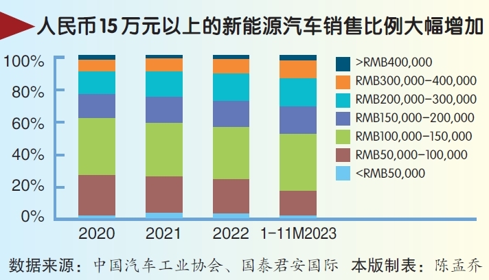 綜合中國汽車工業(yè)協(xié)會、國泰君安國際的數(shù)據(jù)來看,人民幣15萬元以上的新能源汽車銷售比例大幅增加,中高端車型的銷售比例有望進一步上量。乘聯(lián)會《2023年11月份全國乘用車市場深度分析報告》顯示,2023年1—11月,售價超30萬元汽車銷量占比13.4%,累計銷量超259萬輛,同比增長30.8%。售價低于30萬元的汽車累計銷量1674萬輛,同比增長2.2%。