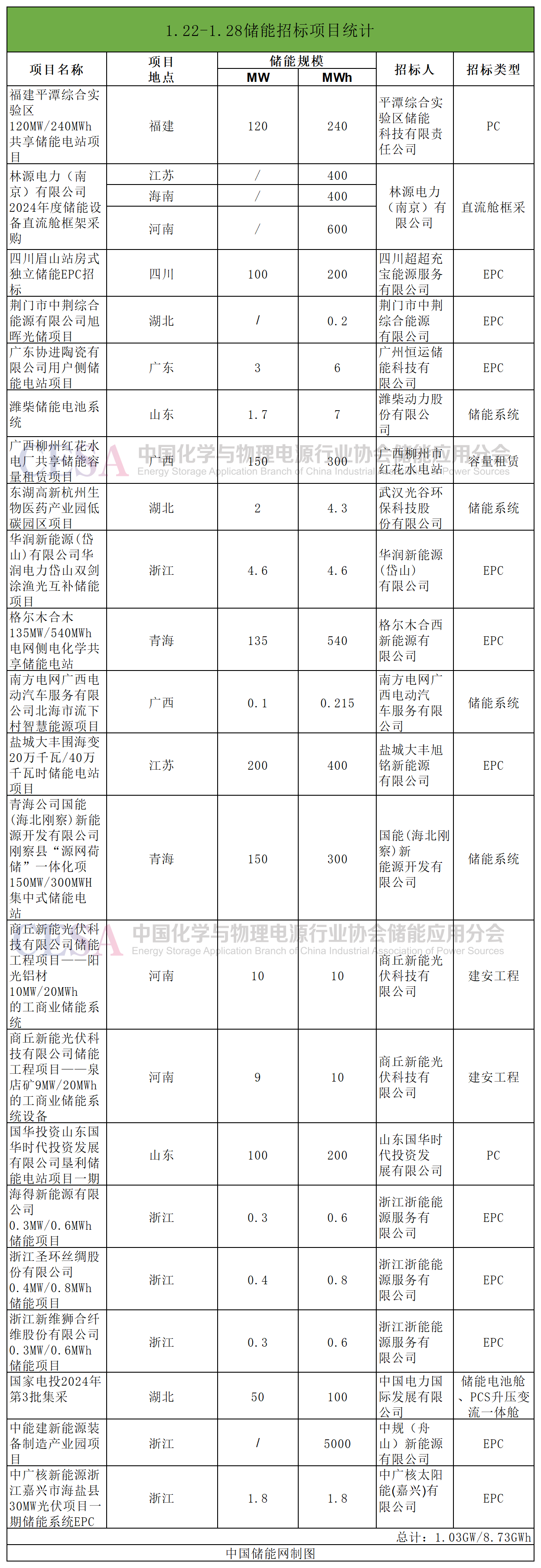 林源電力(南京)有限公司2024年度儲能設(shè)備直流艙框架采購,總?cè)萘繒憾?.4GWh;國家電投2024年第3批集采,包含50MW/100MWh儲能電池艙、87套PCS;中能建新能源裝備制造產(chǎn)業(yè)園項目EPC招標(biāo),項目建設(shè)內(nèi)容為5GWh儲能系統(tǒng)設(shè)備生產(chǎn);青海格爾木合木135MW/540MWh電網(wǎng)側(cè)電化學(xué)共享儲能電站EPC;鹽城大豐圍海變儲能電站項目,規(guī)模為200MW/400MWh。