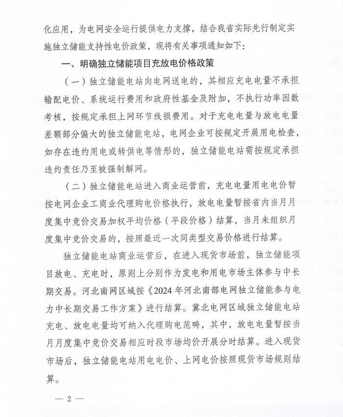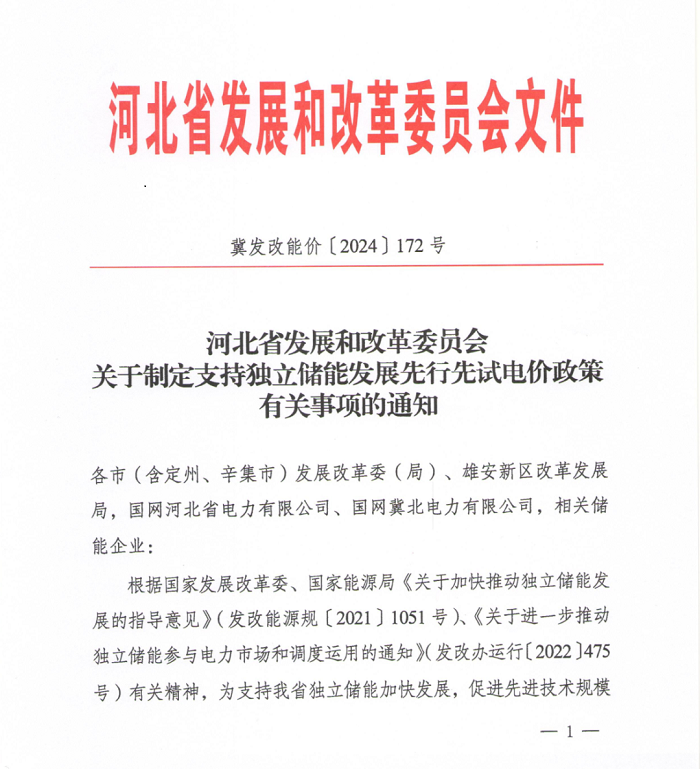 中國(guó)儲(chǔ)能網(wǎng)訊:2024年1月27日,河北省發(fā)展和改革委員會(huì)印發(fā)《關(guān)于制定支持獨(dú)立儲(chǔ)能發(fā)展先行先試電價(jià)政策有關(guān)事項(xiàng)的通知》(簡(jiǎn)稱《通知》)?!锻ㄖ访鞔_,參與競(jìng)爭(zhēng)的獨(dú)立儲(chǔ)能電站容量原則上不低于10萬千瓦、滿功率持續(xù)放電時(shí)長(zhǎng)不低于4小時(shí),2024年1月1日前省級(jí)批復(fù)的電網(wǎng)側(cè)獨(dú)立儲(chǔ)能項(xiàng)目可放寬至不低于2小時(shí)。