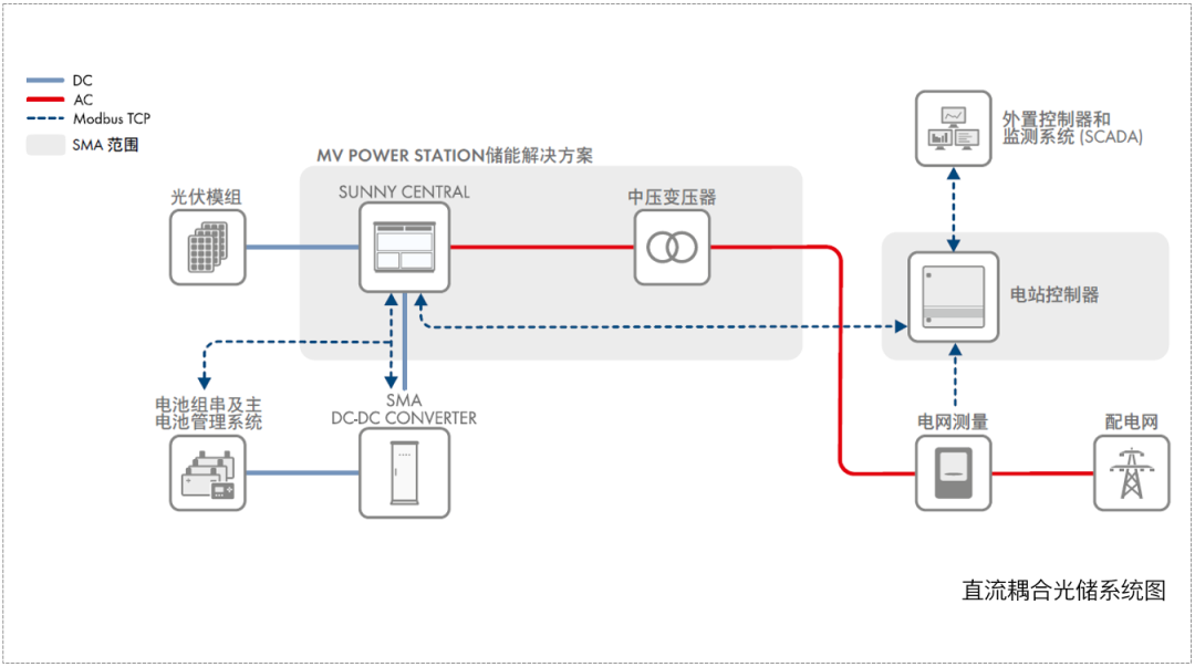 不同于光伏系統(tǒng)、儲能系統(tǒng)彼此獨立運行的AC-Coupling交流耦合方案,SMA DC Coupling直流耦合方案,將儲能電池和太陽能電池板連接在集中式光伏逆變器直流側,光伏逆變器再與中壓變壓器相連,構成完整的直流耦合光儲系統(tǒng)。