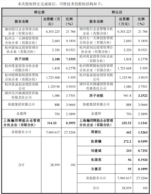 西子潔能披露顯示,2023年12月的股權(quán)轉(zhuǎn)讓完成后,可勝技術(shù)的股權(quán)結(jié)構(gòu)如下: