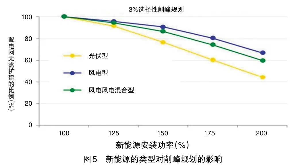 然而,德國與中國還存在一個(gè)重要的區(qū)別。德國的分布式新能源不僅包括分布式光伏發(fā)電,還包括分布式風(fēng)電。由于削峰原則主要解決的是新能源的匯流問題,即分布式新能源在配電變壓器處造成的線路匯集瓶頸問題,因此對分布式風(fēng)電的效果尤為顯著。而在中國,分布式新能源主要以光伏為主。由于大部分光伏安裝在低壓電網(wǎng),主要引發(fā)的是電壓升高越限問題,不僅僅是匯流問題,因此3%的削峰原則在中國實(shí)行的效果可能不如在德國那樣明顯(圖5)。