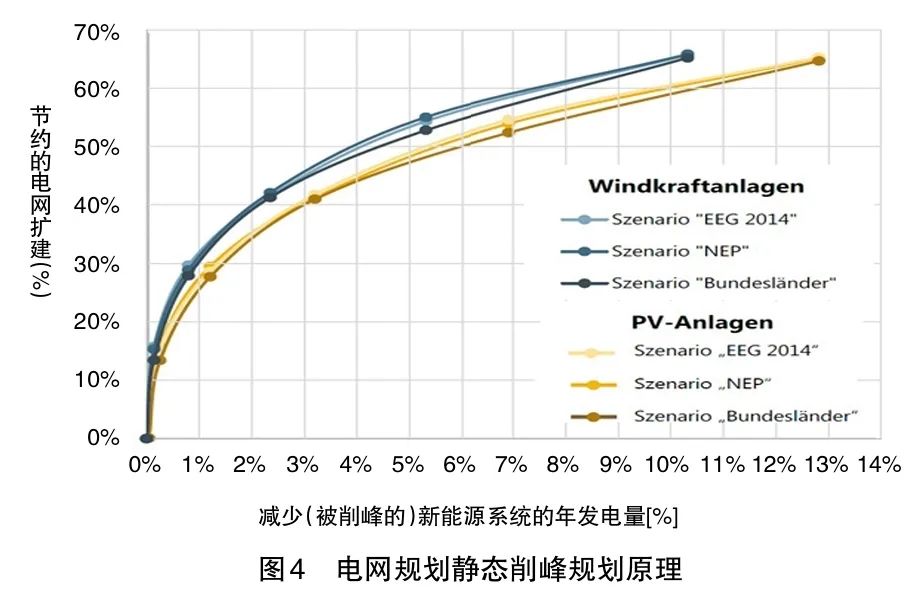鑒于中德兩國配電網(wǎng)的拓?fù)浣Y(jié)構(gòu)差異,分布式風(fēng)電的比例可能較低,主要面臨光伏發(fā)電的挑戰(zhàn)。因此,進(jìn)一步深入研究以選擇最佳削峰規(guī)劃(見圖8)是必要的,相關(guān)光伏設(shè)備的額定功率亦需明確。面對能源危機(jī),德國在電力短缺的情況下放寬了適用于小型光伏發(fā)電設(shè)備的削峰規(guī)定。削峰規(guī)劃的研究在德國主要聚焦于中低壓配電網(wǎng),高壓配電網(wǎng)方面的研究相對有限。另外,根據(jù)德國的研究,在缺乏補(bǔ)貼的情況下,化學(xué)電池在配電網(wǎng)削峰規(guī)劃的應(yīng)用上難以實(shí)現(xiàn)盈利。事實(shí)上,目前所有的電池在電力系統(tǒng)的應(yīng)用都難以靠自身的力量收回投資,其中也包括家用光伏電池在內(nèi)。
