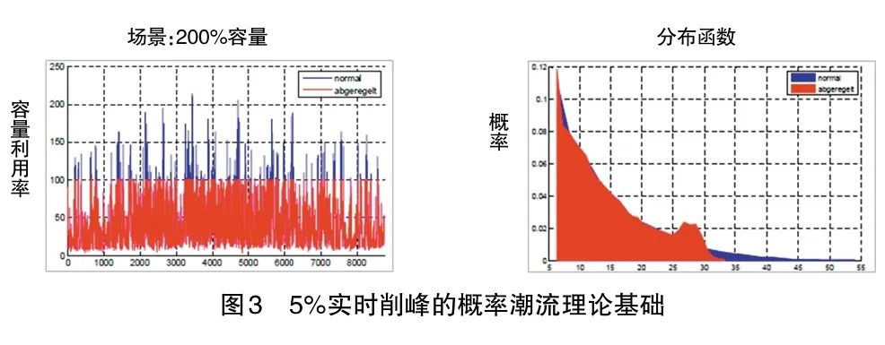 為了應(yīng)對這一挑戰(zhàn),德國第5大能源集團(tuán)EWE的配電網(wǎng)公司提出了“5%實(shí)時(shí)削峰”概念。根據(jù)這一原理,對分布式新能源進(jìn)行5%的電量削峰,就能有效地將配電網(wǎng)容量擴(kuò)大至一倍以上。該原理的核心在于分布式新能源緊貼負(fù)荷,使峰值部分更加集中,容易被負(fù)荷吸收,從而降低了所需削峰的能量(圖3)。