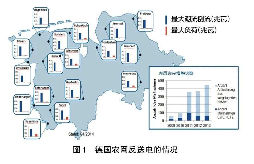 在德國,多達(dá)97%的新能源發(fā)電設(shè)施安裝在配電網(wǎng),尤其是農(nóng)村電網(wǎng)中。德國曾遭遇類似挑戰(zhàn)。以德國北部的農(nóng)村電網(wǎng)為例,其風(fēng)能和光伏的反送功率在2014年就已經(jīng)超過了當(dāng)?shù)仄骄?fù)荷的十倍以上(見圖1)。