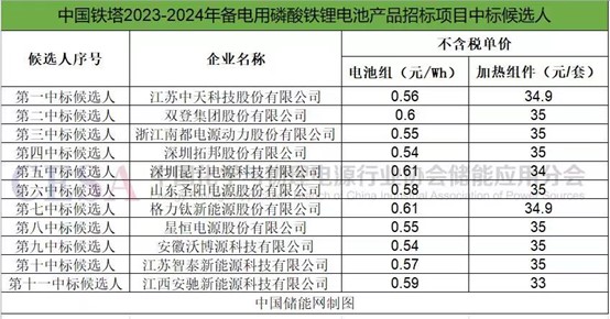 2023年12月28日,中國鐵塔2023-2024年備電用磷酸鐵鋰電池產(chǎn)品集中招標項目公示中標候選人。本項目共33名投標人參與投標,最終,11家企業(yè)入圍中標候選人。