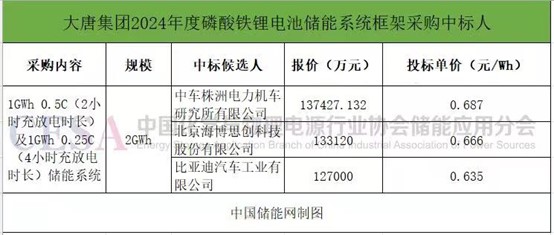 此前的一次大規(guī)模儲能系統(tǒng)集采進展發(fā)生在2月18日,中國大唐集團有限公司2024年度磷酸鐵鋰電池儲能系統(tǒng)框架采購公示中標結(jié)果,中車株洲所、海博思創(chuàng)、比亞迪三家企業(yè)中標,報價區(qū)間為0.635-0.687元/Wh。