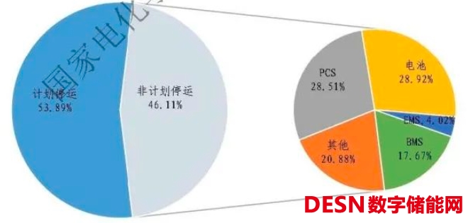 第一個這個是2022年的全年和2023年的上半年,國內(nèi)的電化學儲能站的故障分布度,2023年下半年的數(shù)據(jù)還沒有出來,我們把數(shù)據(jù)進行了歸一化處理,我們按照每一百兆瓦時這個數(shù)據(jù)進行計算,電化學儲能站大家可以看出來,在新的這段時間內(nèi),它的單位能量停機數(shù)增加了68%,它的電池故障的比例從9%上漲到了28.92%,增長了221%,已經(jīng)排到第一的位置了。
