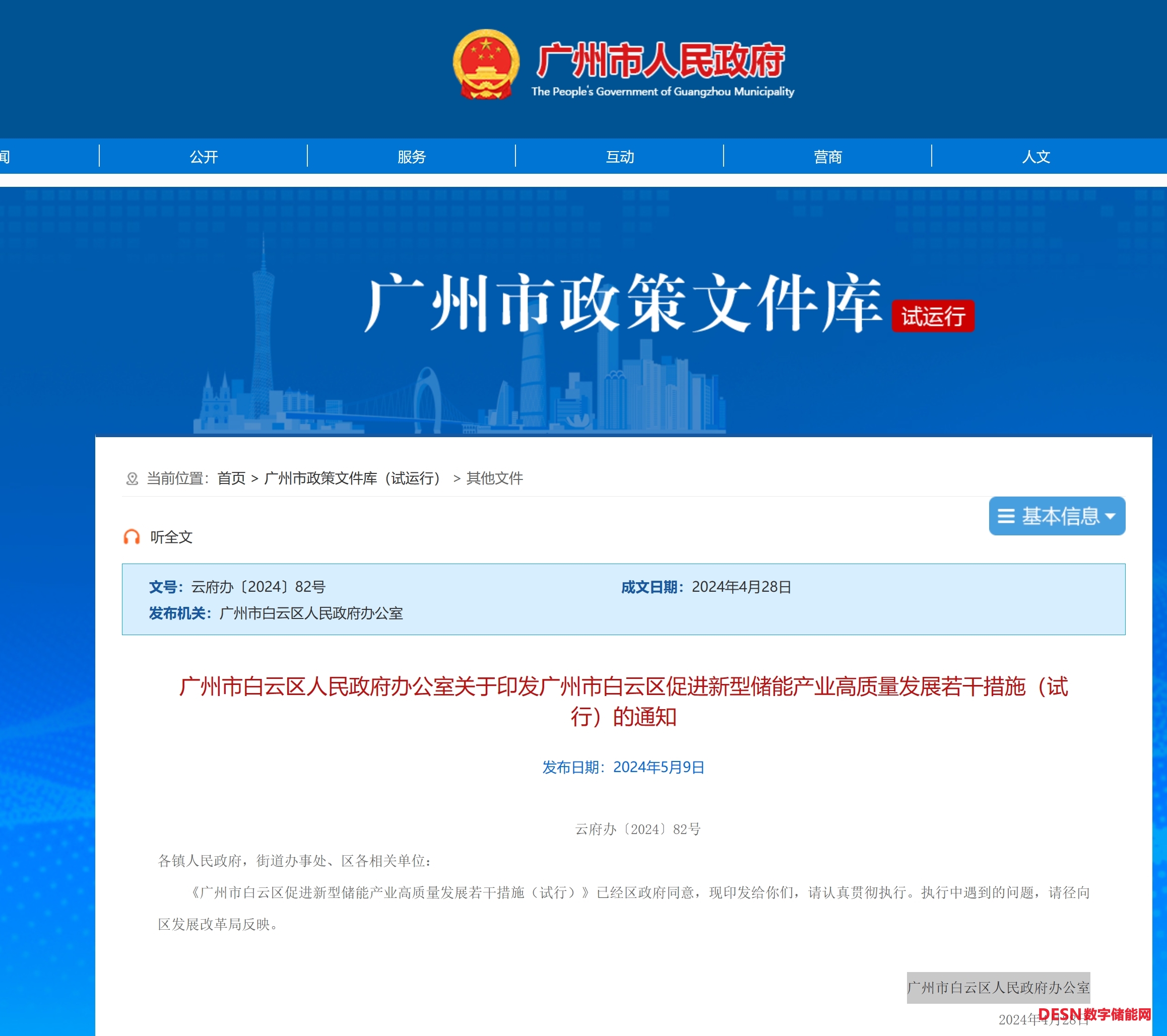 廣州市白云區(qū)人民政府辦公室關(guān)于印發(fā)廣州市白云區(qū)促進新型儲能產(chǎn)業(yè)高質(zhì)量發(fā)展若干措施(試行)的通知