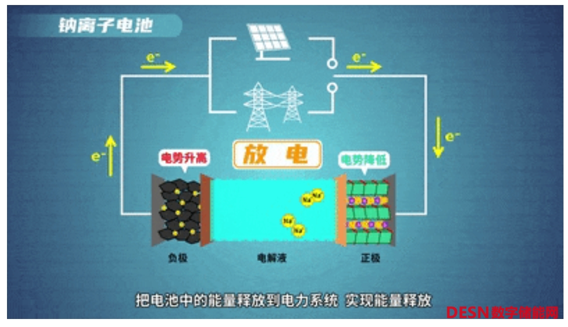 放電時(shí),鈉離子運(yùn)動(dòng)方向與充電過(guò)程相反,正極電勢(shì)降低,負(fù)極電勢(shì)升高,把電池中的能量釋放到電力系統(tǒng),實(shí)現(xiàn)能量釋放。