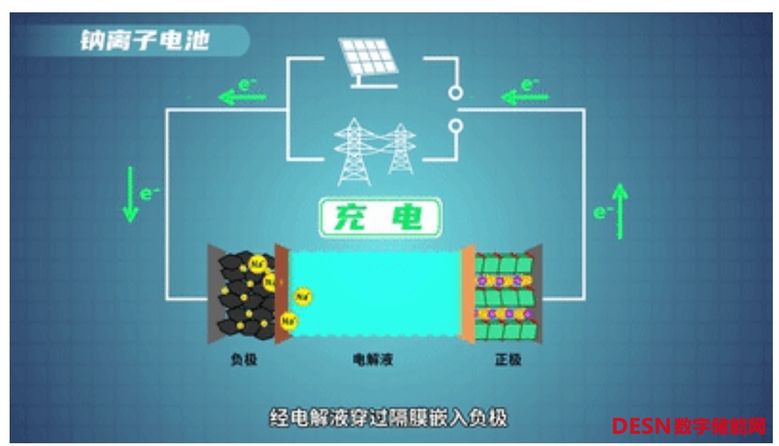 充電時(shí),鈉離子從電池正極脫出,經(jīng)電解液穿過(guò)隔膜嵌入負(fù)極,正極電勢(shì)升高,負(fù)極電勢(shì)降低,把能量?jī)?chǔ)存到電池中,實(shí)現(xiàn)能量存儲(chǔ)。