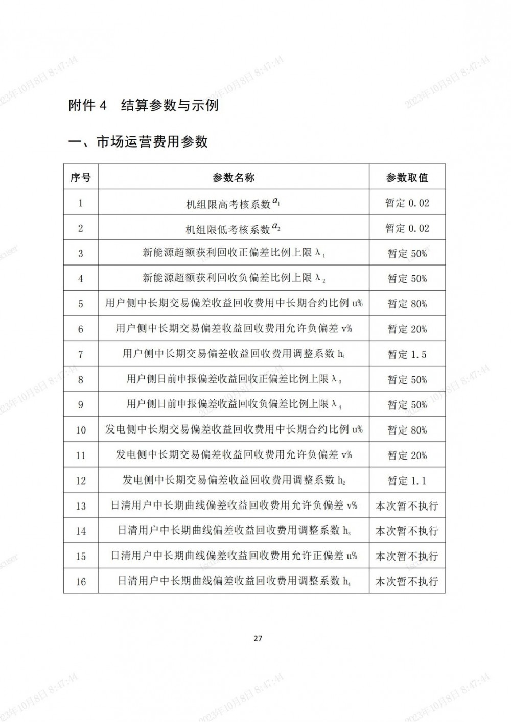 在市場結(jié)算中,方案提到,電能量電費以發(fā)電側(cè)節(jié)點電價進(jìn)行結(jié)算,發(fā)電側(cè)進(jìn)行雙偏差結(jié)算,日前出清電量與中長期合約電量的偏差按照機(jī)組所在節(jié)點日前出清電價結(jié)算,機(jī)組上網(wǎng)電量與日前出清電量的偏差按照機(jī)組所在節(jié)點實時出清電價結(jié)算。新能源場站,按照上網(wǎng)電量的 90%確定優(yōu)發(fā)電量,日前偏差結(jié)算電量按照日前市場預(yù)測電量與優(yōu)發(fā)電量的偏差值確定,實時偏差結(jié)算電量按照上網(wǎng)電量與日前市場預(yù)測電量的偏差值確定。儲能充放電均采用所在節(jié)點電價結(jié)算。