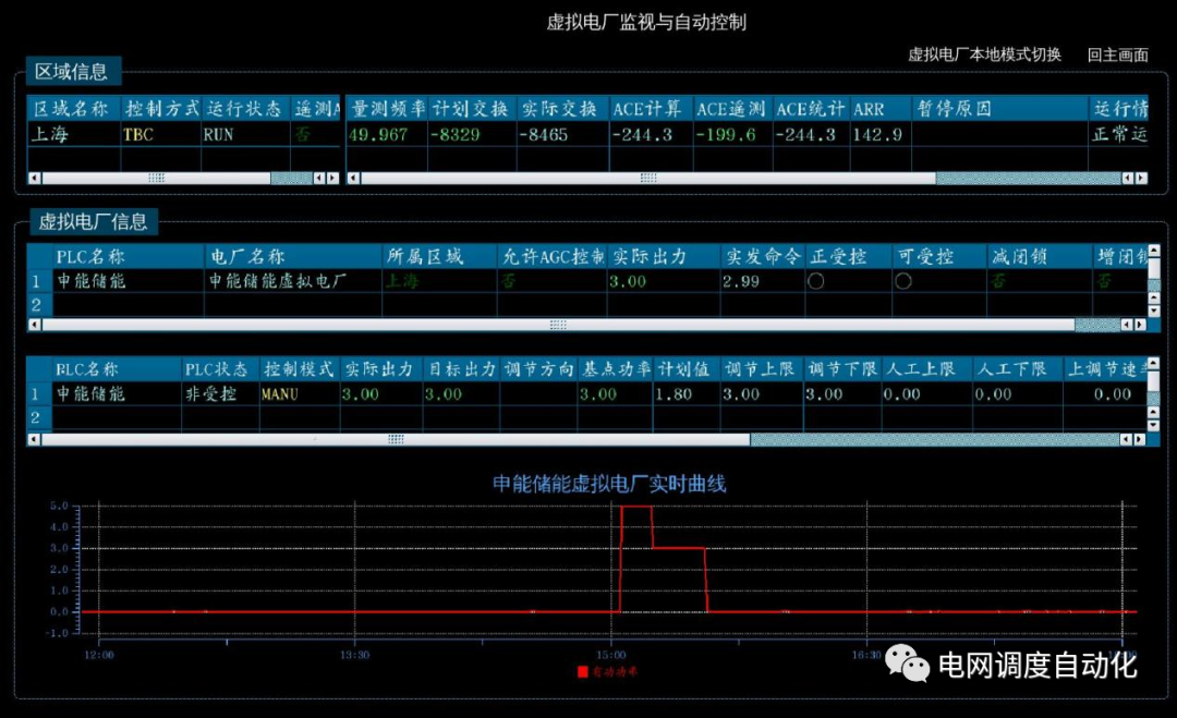 為驗(yàn)證前期虛擬電廠接入成效,借此高溫緊平衡的場(chǎng)景,調(diào)控中心臨時(shí)調(diào)用虛擬電廠調(diào)節(jié)資源,開(kāi)展虛擬電廠參與電網(wǎng)調(diào)頻的實(shí)測(cè)驗(yàn)證。15時(shí)04分,調(diào)度員投入虛擬電廠控制功能,按照虛擬電廠上傳的調(diào)節(jié)空間手動(dòng)測(cè)試下發(fā)控制指令,通過(guò)反饋的信息顯示虛擬電廠即時(shí)正確響應(yīng)。其中申能儲(chǔ)能虛擬電廠放電功率最高達(dá)4.95MW,與電網(wǎng)需求一致,助力頻率穩(wěn)定。