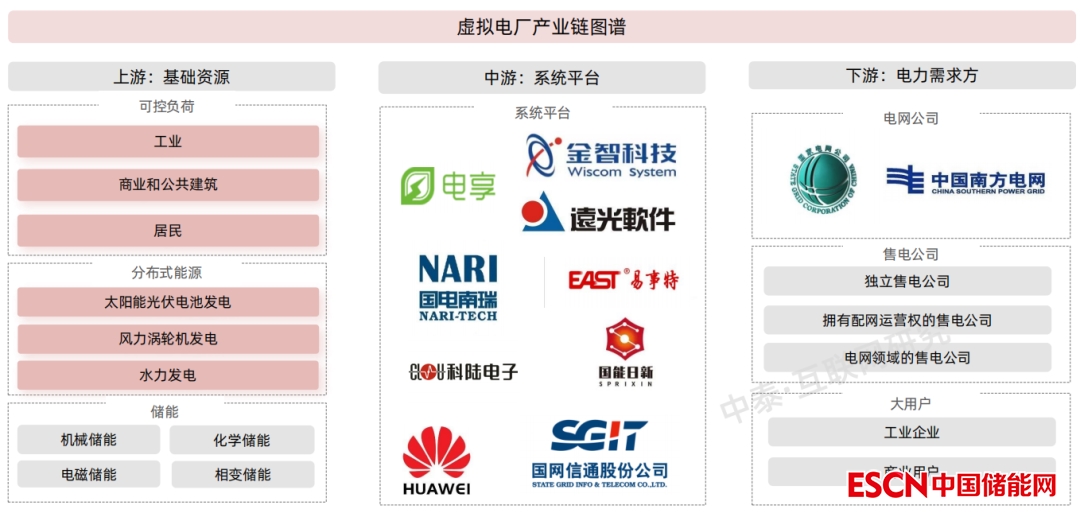 從產(chǎn)業(yè)鏈來看,虛擬電廠產(chǎn)業(yè)鏈已有雛形,上游基礎(chǔ)資源、中游虛擬電廠運(yùn)營、下游電力需求方。具體來看,產(chǎn)業(yè)鏈上游由可控負(fù)荷、分布式能源與儲能構(gòu)成;中游為提供虛擬電廠運(yùn)營服務(wù)與技術(shù)支持的系統(tǒng)平臺;下游為則是電力公司、售電公司、大用戶構(gòu)成的電力需求方。