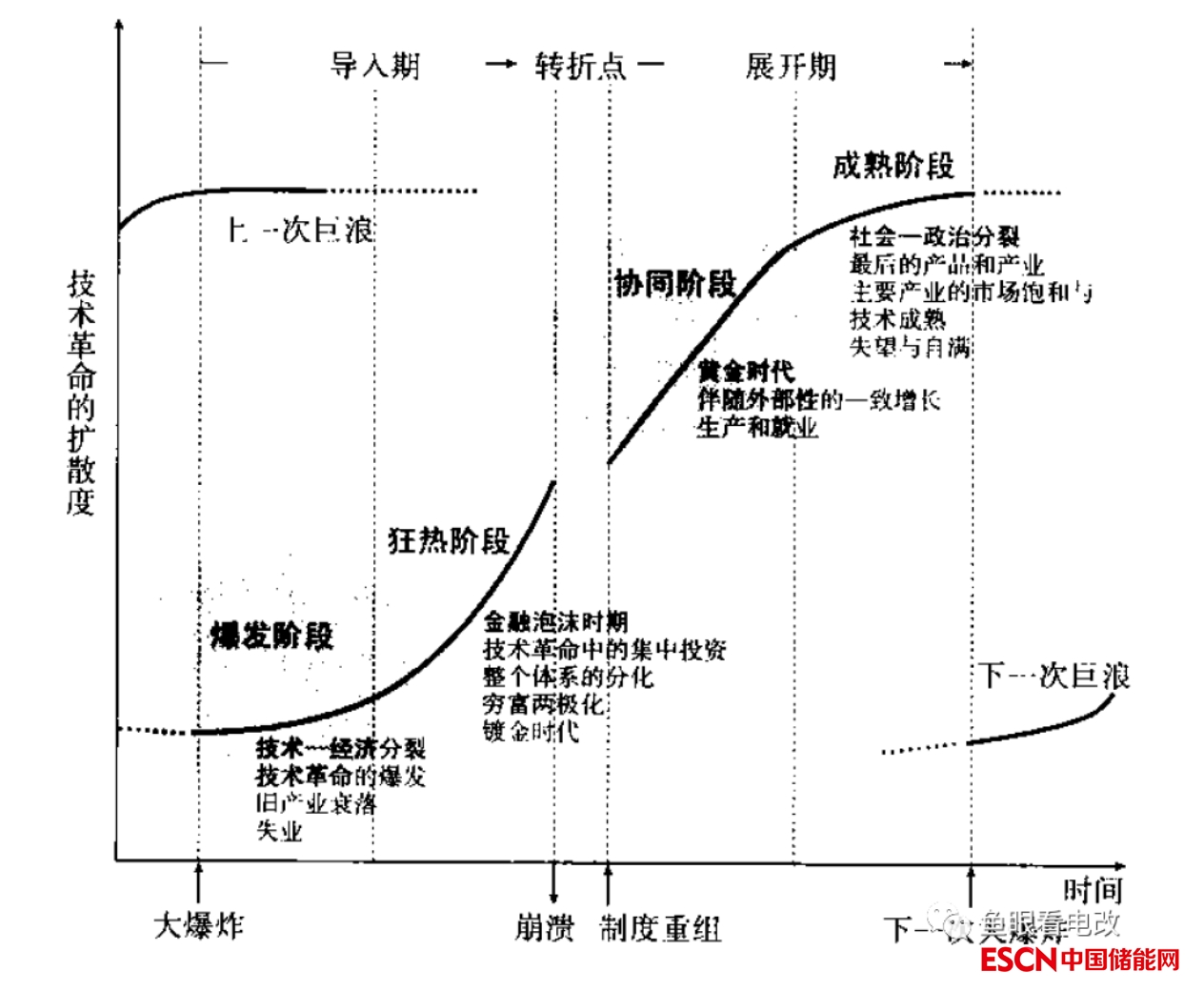 《技術(shù)革命與金融資本》中,對(duì)新技術(shù)的應(yīng)用分為兩個(gè)周期:導(dǎo)入期(包括爆發(fā)階段和狂熱階段)和展開期(包括協(xié)同階段和成熟階段)。