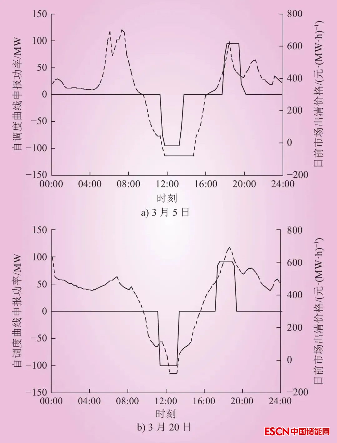 以某獨立儲能2022年3月5日、20日申報自調(diào)度曲線和日前現(xiàn)貨市場出清價格為例,申報與出清結果匹配程度如圖3所示。從圖3可以看出,2022年3月20日自調(diào)度曲線與日前市場出清價格契合程度較2022年3月5日有顯著提升。