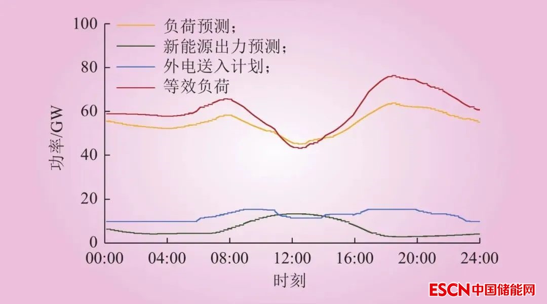 山東3座獨立儲能電站某競價日實際申報的自調(diào)度曲線如圖1所示。在圖1中,功率 > 0,表明該時刻處于放電狀態(tài);功率 < 0,則處于充電狀態(tài)。等效負荷曲線能夠反映供需變化形勢,從而為測算提供依據(jù)。對獨立儲能運營商來說,等效負荷曲線可根據(jù)市場公開信息得到。運行日的等效負荷曲線如圖2所示。從圖2可以看出,當天3座獨立儲能均選擇在午間低谷時段充電,并在晚間高峰時段放電。自調(diào)度曲線與凈負荷曲線峰谷變化緊密相關,能夠?qū)崿F(xiàn)削峰填谷,緩解高峰供應緊張問題。