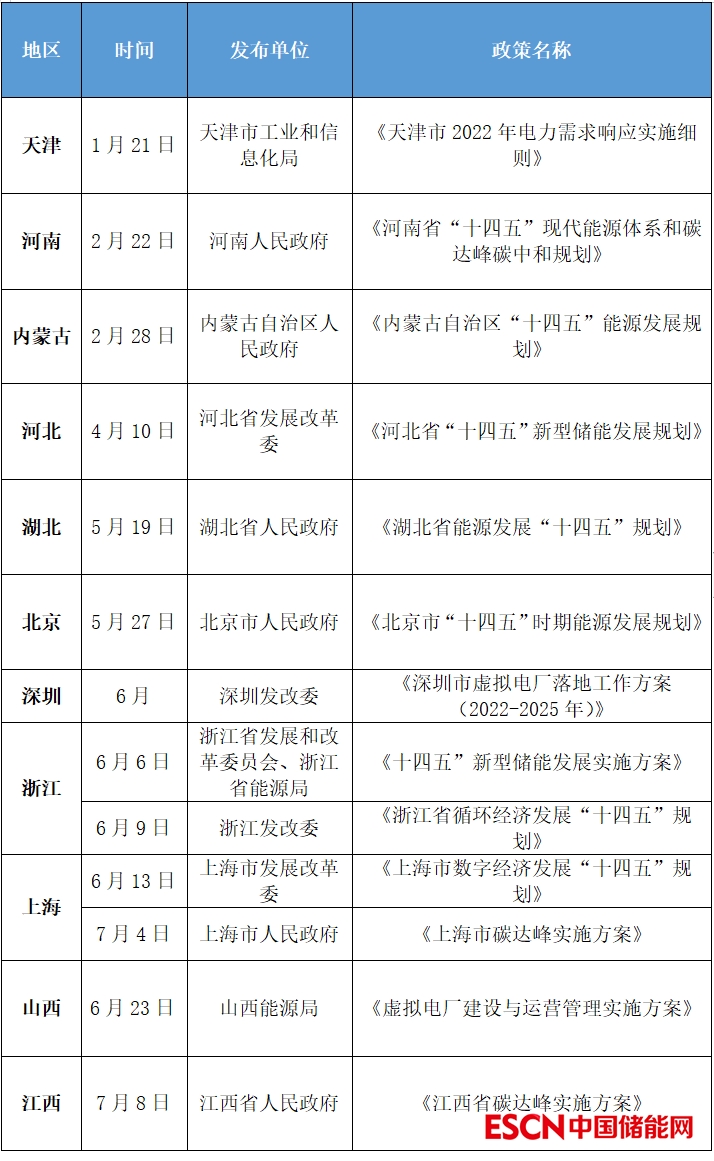 今年以來,北京、深圳、山西等近十余個省份相繼出臺了相關(guān)政策,支持虛擬電廠的發(fā)展。其中山西省能源局在今年6月發(fā)布的《虛擬電廠建設(shè)與運營管理實施方案》為目前國內(nèi)首份省級虛擬電廠運營管理文件,文件中明確到2025年,深圳將建成具備100萬千瓦級可調(diào)能力的虛擬電廠。