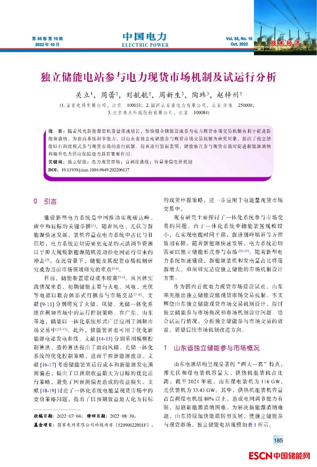 GUAN Li, ZHOU Lei, LIU Hanghang, et al. Analysis of independent energy storage power station participating in power spot market mechanism and trial operation[J]. Electric Power, 2022, 55(10): 185-190.