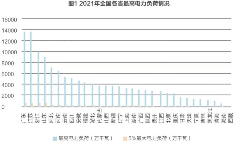隨著可再生能源大規(guī)模接入,電網(wǎng)“雙高”、“雙峰”特性明顯,備用容量不足。極端情況下,2030年電網(wǎng)備用容量缺口將達到2億千瓦。預(yù)計“十四五”期間電網(wǎng)負荷最大日峰谷差率將達到36%,“十五五”期間將達到40%,電網(wǎng)調(diào)峰壓力持續(xù)增加。電力系統(tǒng)時段性、靈活性調(diào)節(jié)能力不足現(xiàn)象進一步加劇,需要多措并舉提升系統(tǒng)調(diào)節(jié)能力,保障供需平衡。截至2021年底,全國最大負荷約12億千瓦,按照5%的可調(diào)節(jié)能力測算約為6000萬千瓦可調(diào)負荷能力,全國各省最大負荷及響應(yīng)能力,如下圖所示。