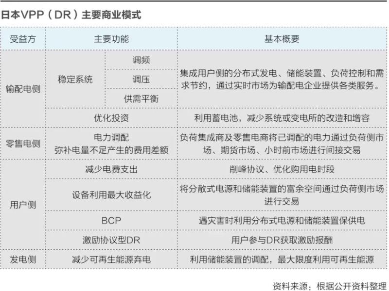 日本自2011年開始高度重視需求響應(yīng)技術(shù)開發(fā)和推廣應(yīng)用。2015年,日本政府出臺了《日本再興戰(zhàn)略(2015)》,首次明確提出推廣VPP政策。2016年,《能源革新戰(zhàn)略》又進一步提出了推動VPP技術(shù)開發(fā)的示范項目計劃(2016-2020)。目前,日本正在開展典型的跨空間自主調(diào)度型虛擬電廠試驗項目。據(jù)日本信息產(chǎn)業(yè)省測算,到2030年日本的VPP裝機容量可達3770萬千瓦,VPP/DR投資總和預(yù)計將達到730億日元。日本推廣VPP(DR)的重點集中在住宅、辦公大樓、工廠、商業(yè)設(shè)施、公共事業(yè)和電動汽車等六大領(lǐng)域,以“光伏+儲能”為主要形式,其商業(yè)模式主要見下圖。