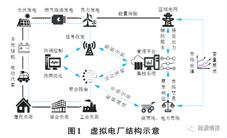 虛擬電廠顧名思義就是虛擬化的電廠,其結構示意如圖1所示。它不是一個真實的物理電廠,但起到了電廠的作用:發(fā)出電能,參與能量市場;通過調節(jié)功率來參與輔助服務市場調峰、調頻等。