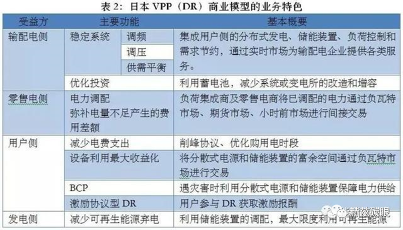 日本推廣VPP(DR)的重點集中在住宅、辦公大樓、工廠、商業(yè)設施、公共事業(yè)和電動汽車等六大領域,以“光伏+儲能”為主要形式,如下圖:列舉了日本VPP(DR)商業(yè)模式的主要業(yè)務特色。