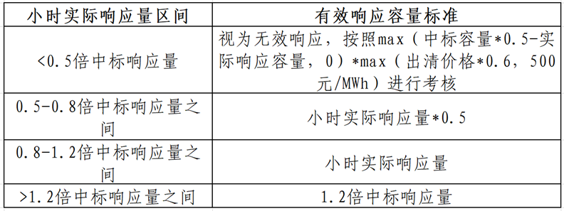 交易結(jié)算進(jìn)行實(shí)際響應(yīng)容量進(jìn)行,按以下規(guī)則計(jì)算有效響應(yīng)容量,相應(yīng)費(fèi)用=有效響應(yīng)容量*出清價(jià)格。