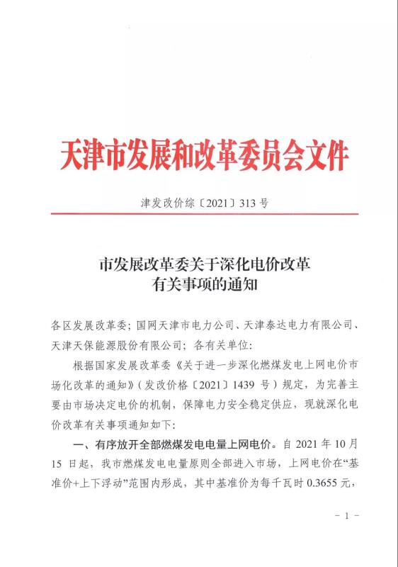 天津:關(guān)于深化電價改革有關(guān)事項的通知