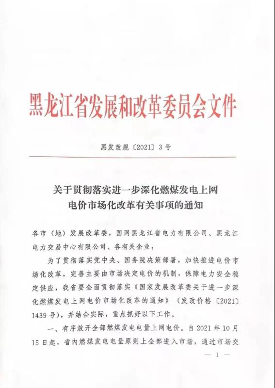黑龍江:關(guān)于貫徹落實(shí)進(jìn)一步深化燃煤發(fā)電上網(wǎng)電價(jià)市場(chǎng)化改革有關(guān)事項(xiàng)的通知