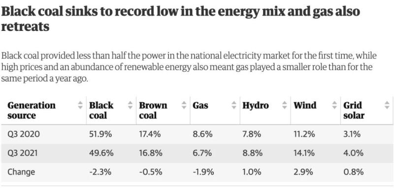 電網(wǎng)規(guī)模的風(fēng)能和太陽(yáng)能發(fā)電裝機(jī)在本季度達(dá)到新高,從6月份的118MW增加到9月份的351MW,增長(zhǎng)了三倍。風(fēng)能、太陽(yáng)能和水力發(fā)電廠提供了全國(guó)電力市場(chǎng)近三分之一的電力需求,達(dá)到創(chuàng)紀(jì)錄的31.7%。在9月24日的一個(gè)30分鐘時(shí)段內(nèi),可再生能源滿足了61.4%的需求——也創(chuàng)下新高。同時(shí),沒有莫里森政府大肆吹噓的“天然氣帶動(dòng)的復(fù)蘇”跡象,維多利亞州朗福德天然氣廠的供應(yīng)中斷最初導(dǎo)致阿德萊德、悉尼和墨爾本化石燃料現(xiàn)貨價(jià)格創(chuàng)紀(jì)錄或接近紀(jì)錄。天然氣在整個(gè)季度的電力結(jié)構(gòu)中所占份額也較上年同期下降了五分之一;硬煤發(fā)電比例也首次降至50%以下。