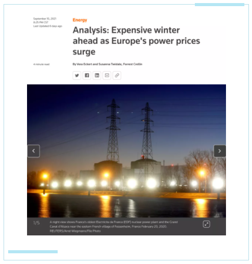 中國儲能網(wǎng)訊:據(jù)路透社報道,由于亞洲經(jīng)濟復蘇導致相關(guān)煤炭和天然氣價格飆升,加上較高的碳價、油價和不利于本地可再生能源的氣候等多種因素的綜合作用,歐洲電力批發(fā)市場價格近幾周來創(chuàng)紀錄上漲,而且不太可能在年底前緩解,這意味著歐洲消費者將迎來一個昂貴的取暖季節(jié)。