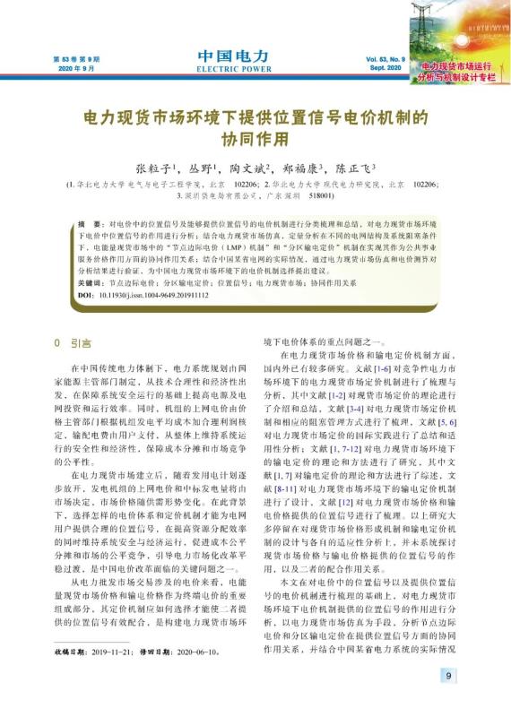 張粒子, 叢野, 陶文斌, 等. 電力現(xiàn)貨市場(chǎng)環(huán)境下提供位置信號(hào)電價(jià)機(jī)制的協(xié)同作用[J]. 中國(guó)電力, 2020, 53(9): 9-18, 46.