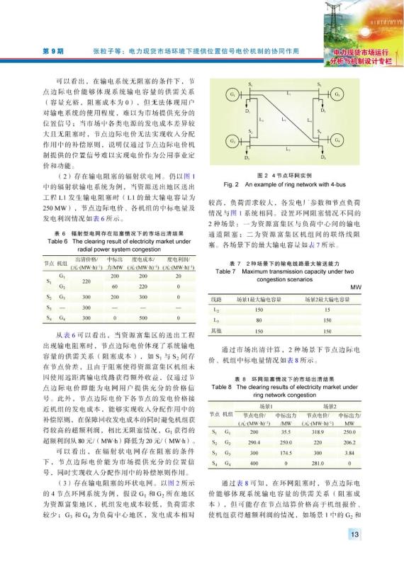 (3)在無(wú)阻塞電網(wǎng)中,節(jié)點(diǎn)邊際電價(jià)提供的位置信號(hào)不充分,其原因在于沒(méi)有體現(xiàn)輸電成本的公平分?jǐn)?,需要采取分區(qū)輸電定價(jià)機(jī)制予以配合;在輻射網(wǎng)阻塞時(shí),節(jié)點(diǎn)邊際電價(jià)提供的位置信號(hào)能夠有效實(shí)現(xiàn)電價(jià)作為公用事業(yè)價(jià)格的功能,無(wú)需分區(qū)輸電定價(jià)的配合;在環(huán)網(wǎng)阻塞時(shí),節(jié)點(diǎn)邊際電價(jià)提供的位置信號(hào)不能充分實(shí)現(xiàn)電價(jià)作為公用事業(yè)定價(jià)的作用,產(chǎn)生這一現(xiàn)象的原因之一是為滿足系統(tǒng)運(yùn)行約束,造成的機(jī)組出力調(diào)整產(chǎn)生的,需要通過(guò)未來(lái)的源網(wǎng)投資予以解決。