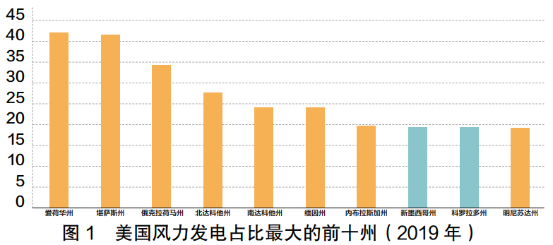 美國各州的市場情況為新能源的消納和電力現(xiàn)貨市場的關(guān)系提供了一個縮影。如圖1所示,美國風(fēng)力發(fā)電占比最大的十個州中,除了新墨西哥和科羅拉多州以外,其它八個州都位于區(qū)域現(xiàn)貨市場之內(nèi)。但是,在許多縱向一體化的州(主要是位于中西部的州,比如亞利桑那州和內(nèi)華達(dá)州等),盡管風(fēng)力資源非常豐富,但風(fēng)力發(fā)電微乎其微。